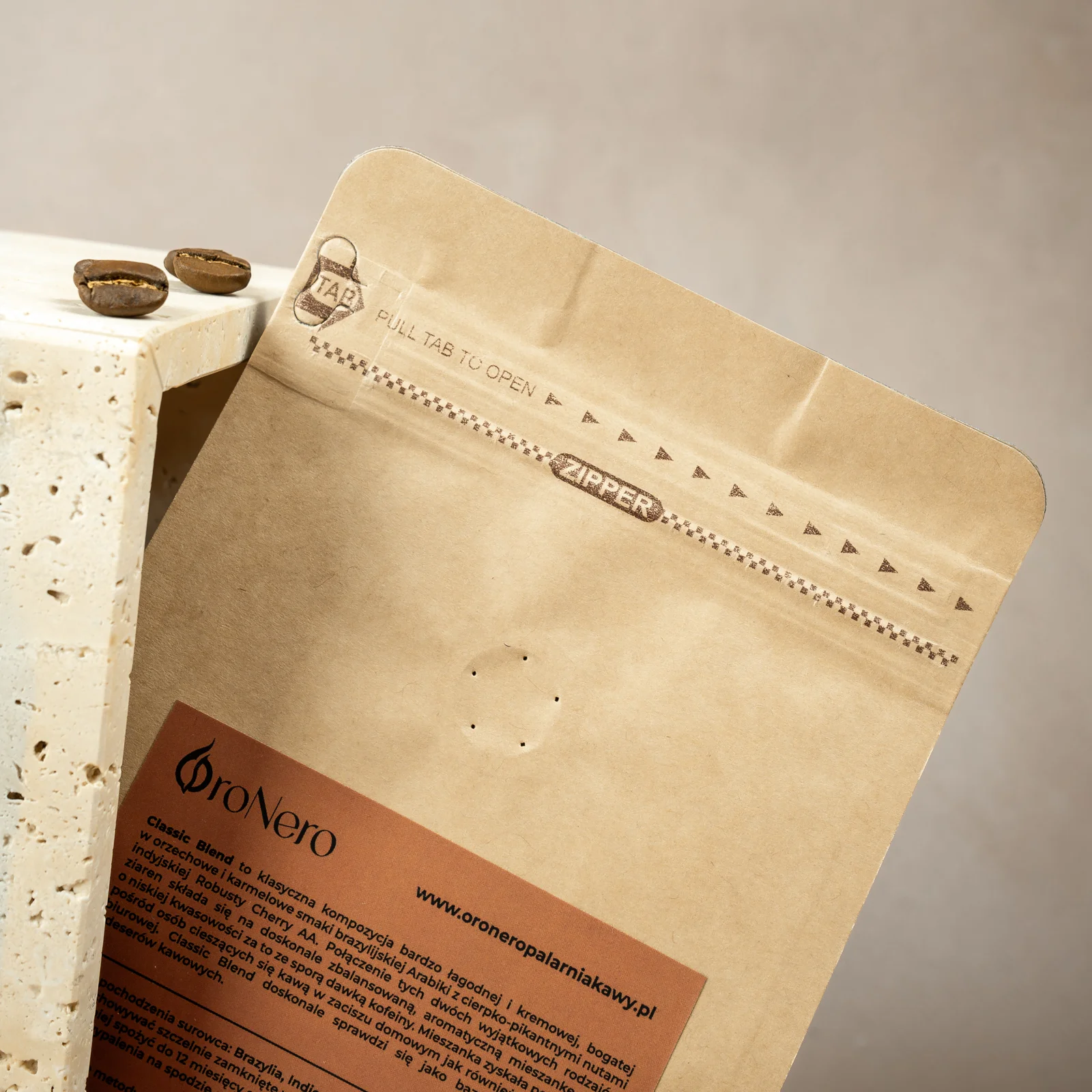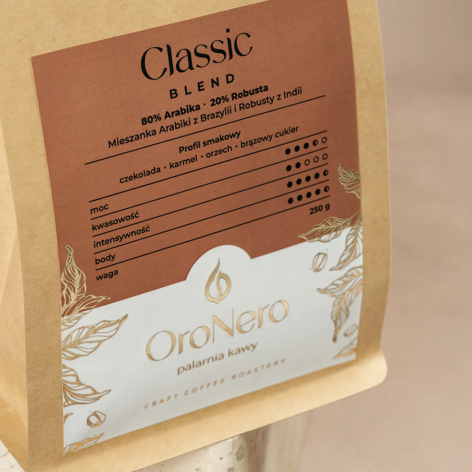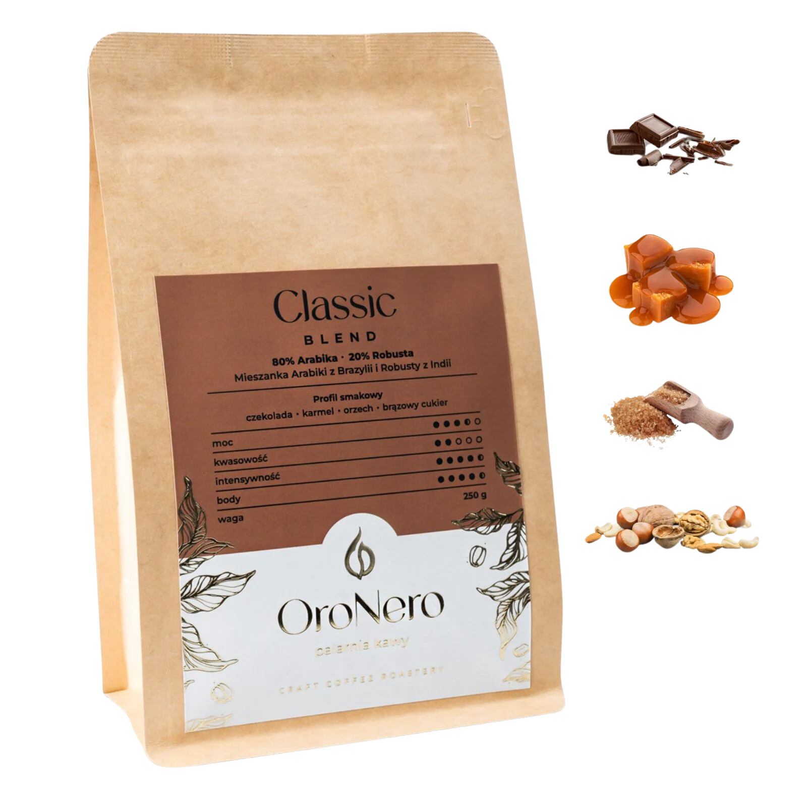 Classic Blend to klasyczna kompozycja bardzo łagodnej i kremowej, bogatej w orzechowe i karmelowe smaki brazylijskiej Arabiki z cierpko-pikantnymi nutami indyjskiej Robusty Cherry AA.
