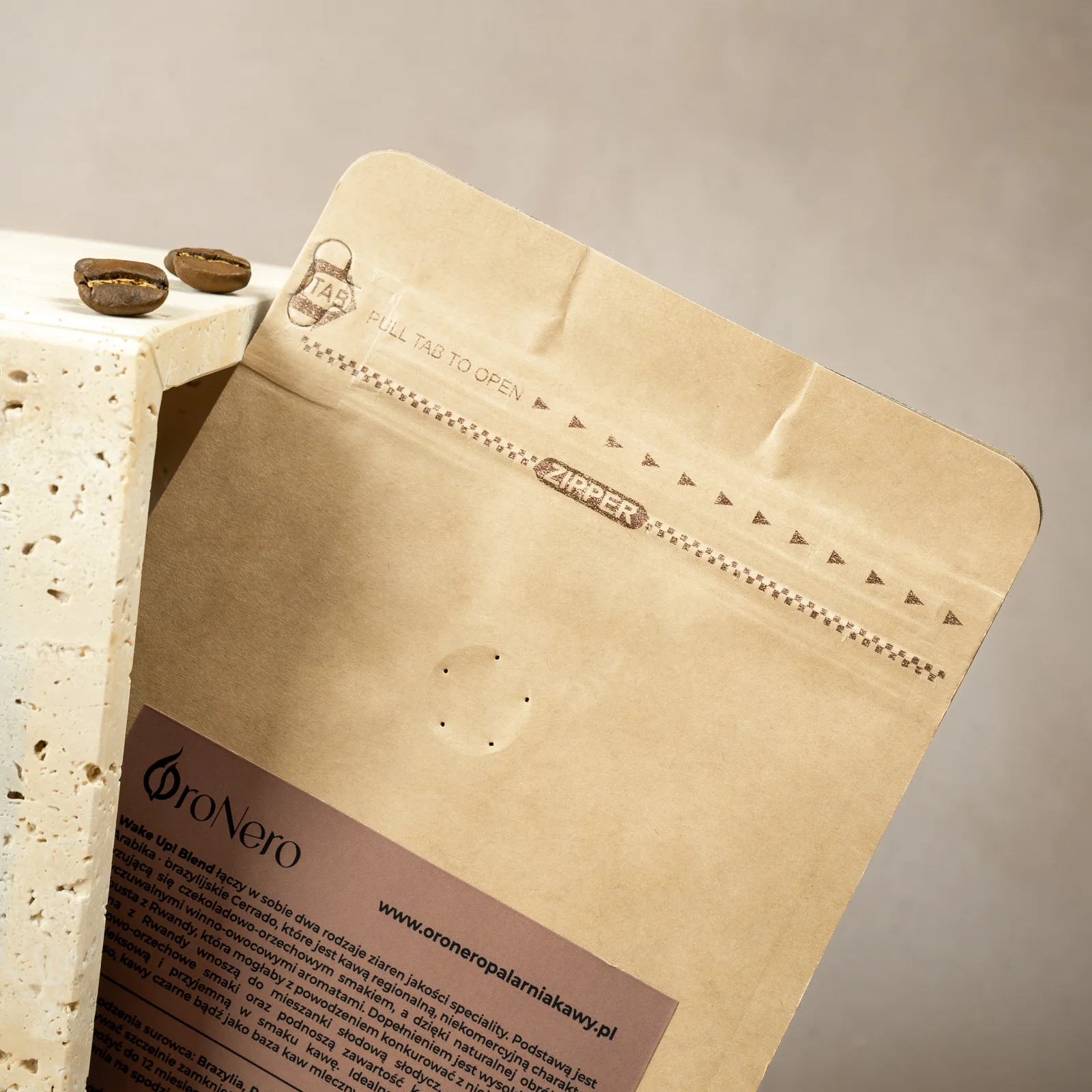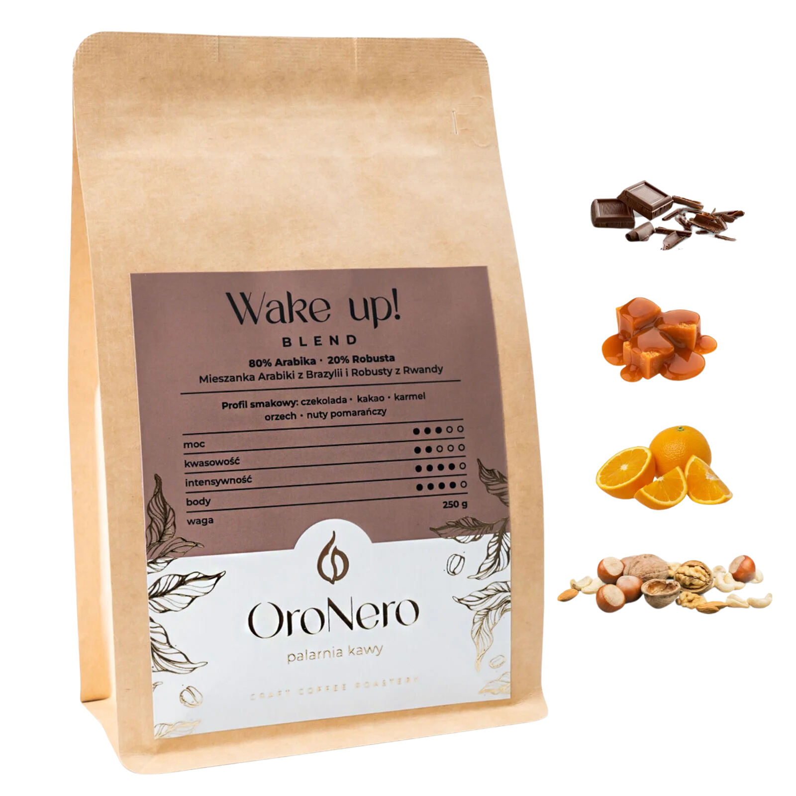 Wake Up! Blend łączy w sobie dwa rodzaje ziaren jakości speciality. Podstawą jest Arabika – brazylijskie Cerrado, które jest kawą regionalną, niekomercyjną charakteryzującą się czekoladowo-orzechowym smakiem a dzięki naturalnej obróbce wyczuwamy w niej winno-owocowe aromaty.
